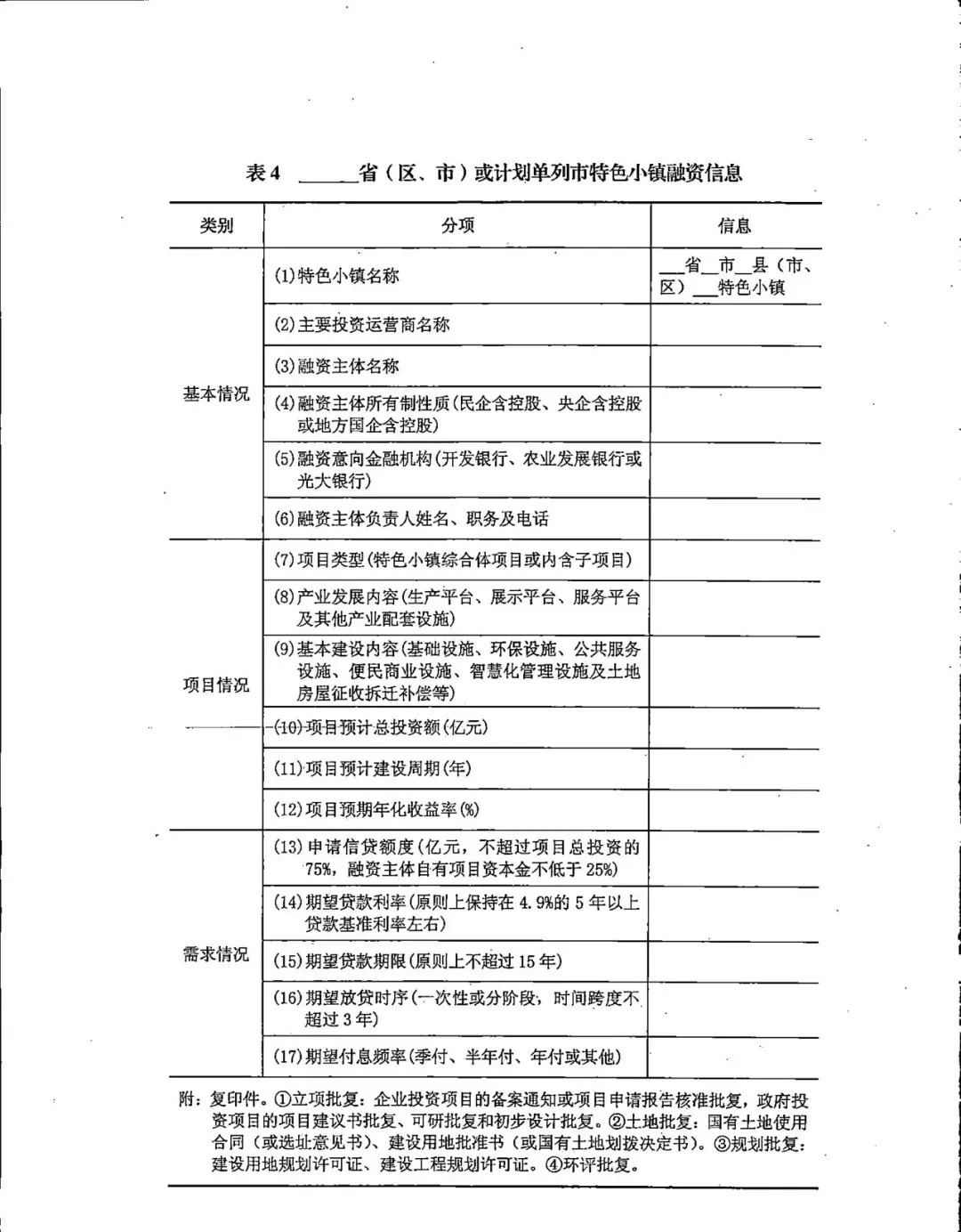 在附件表4《__?。▍^(qū)、市)或計(jì)劃單列市特征小鎮(zhèn)融資信息》中,有對(duì)特色小鎮(zhèn)建造的融資需求狀況的調(diào)研了解,包含請(qǐng)求信貸額度、期望信貸利率、期望借款期限、期望放貸時(shí)序、期望付息頻率等方面的信息,國家經(jīng)過相關(guān)的銀行安排支撐特征小鎮(zhèn)展開。